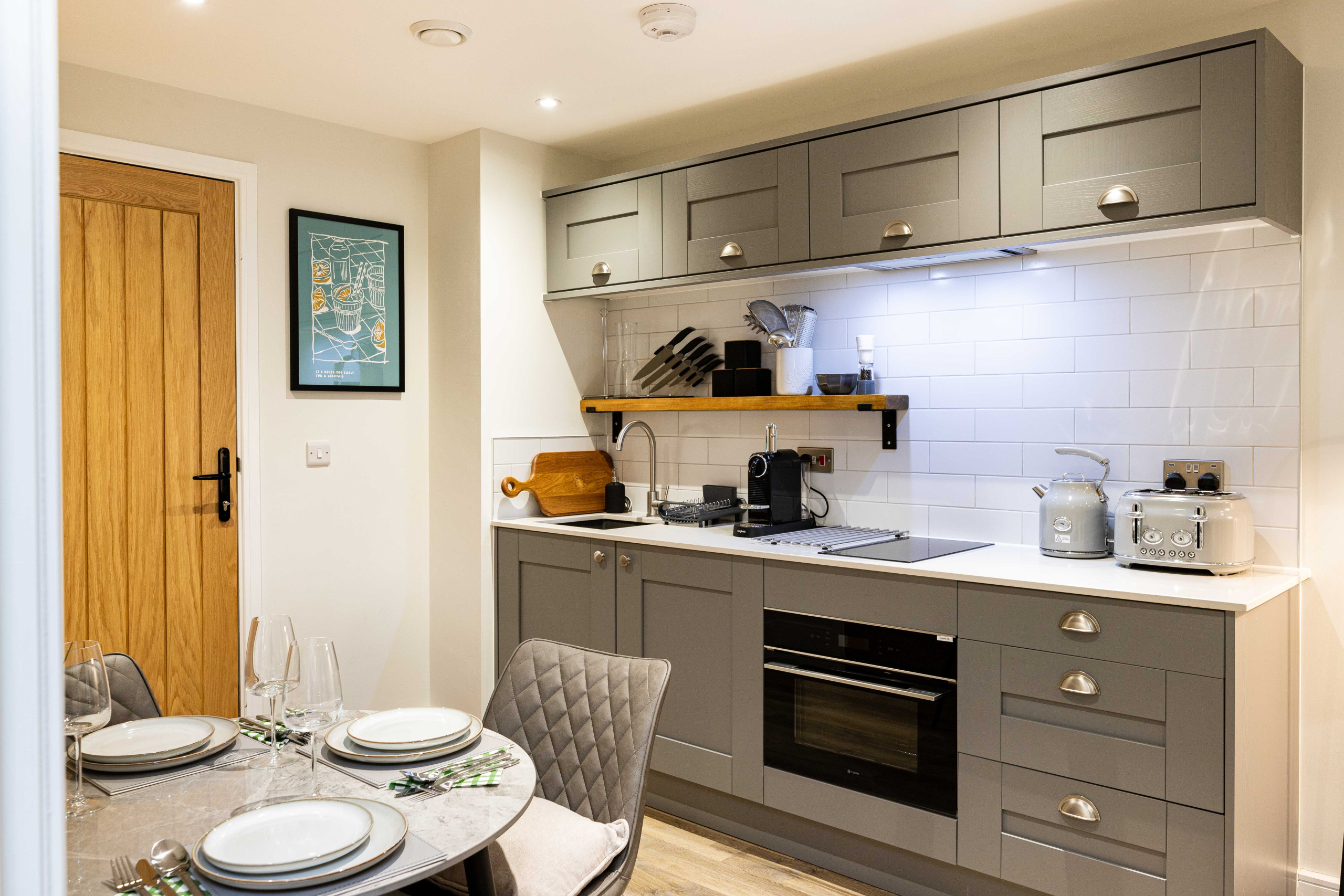 Kitchen area: Offering a fully integrated kitchen with a range of appliances and equipped with all you need for a self-catering stay including an electric oven, microwave, induction hob, Nespresso coffee machine and under-counter fridge with freezer drawer compartment.