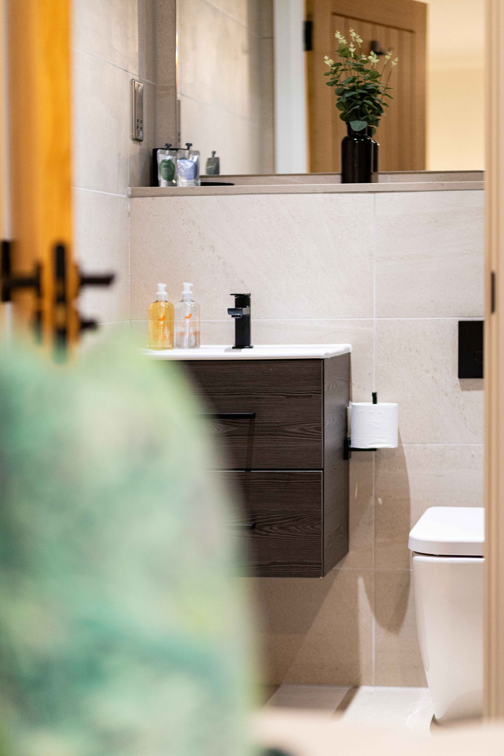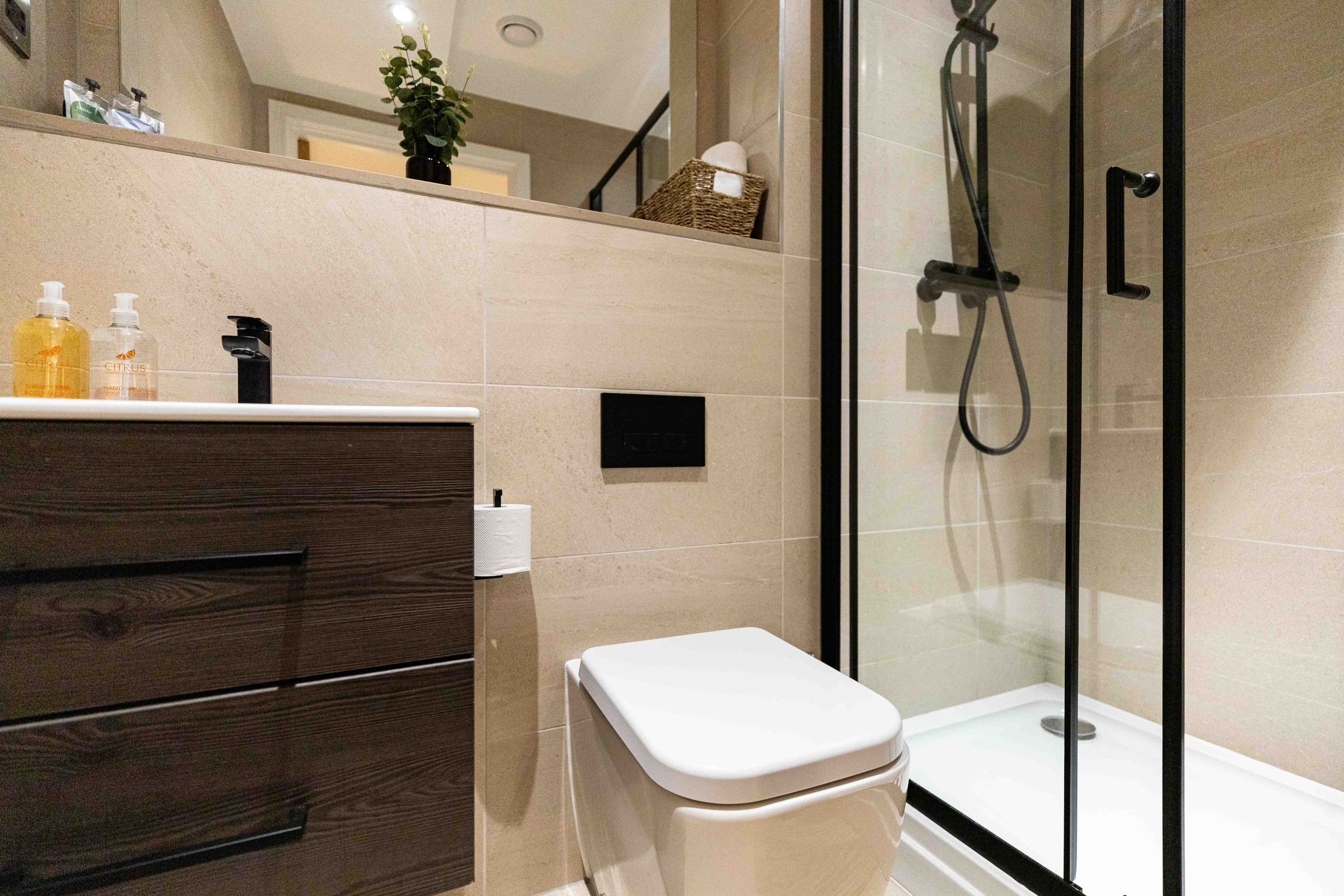 Bathroom: A modern and luxury shower room with large shower with fixed overhead shower head plus separate handheld attachment, wash basin and toilet. Under floor heating.