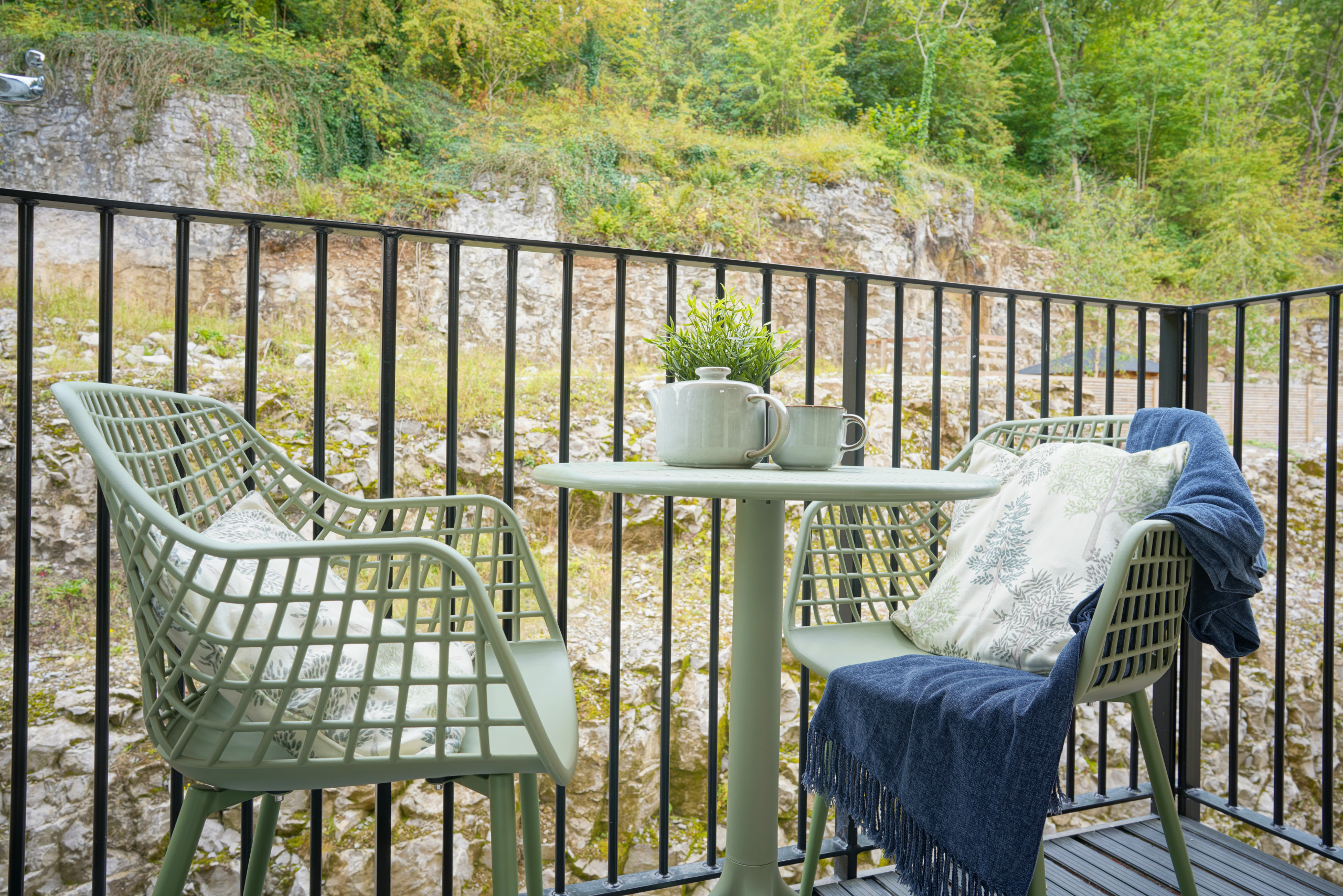 Balcony: French doors opening onto a balcony with outdoor furniture overlooking the limestone cliffs