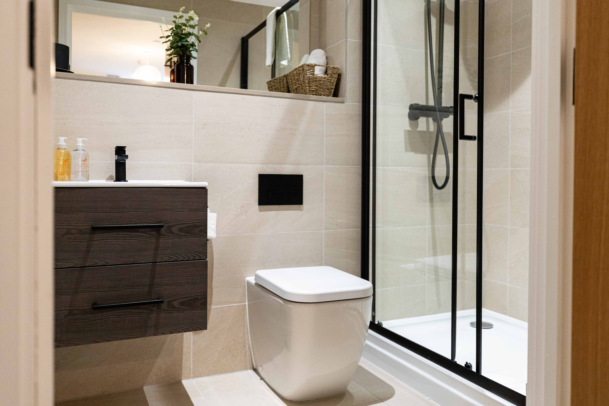 Bathroom: A modern and luxury shower room with large shower with fixed overhead shower head plus separate handheld attachment, wash basin and toilet. Under floor heating.