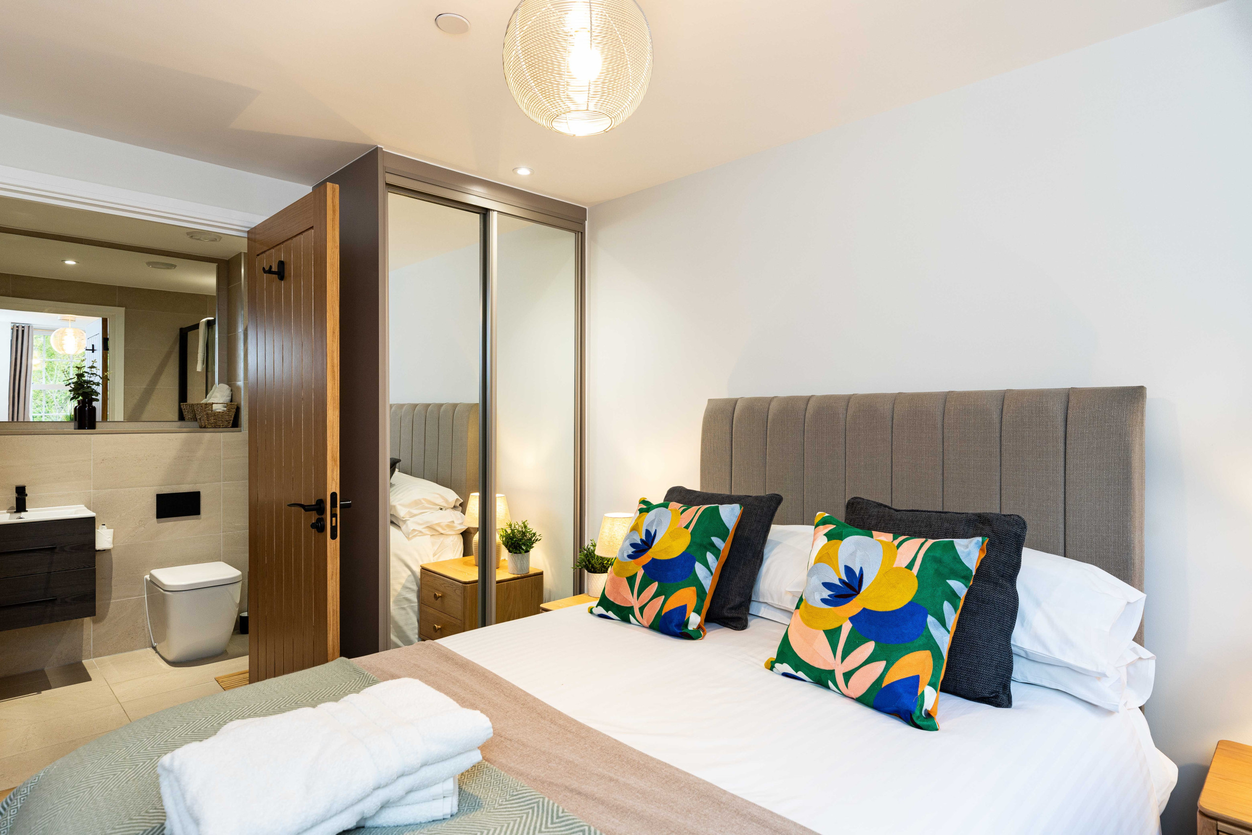 En-suite bathroom: A modern and luxury shower room with large shower with fixed overhead shower head plus separate handheld attachment, wash basin and toilet. Under floor heating.