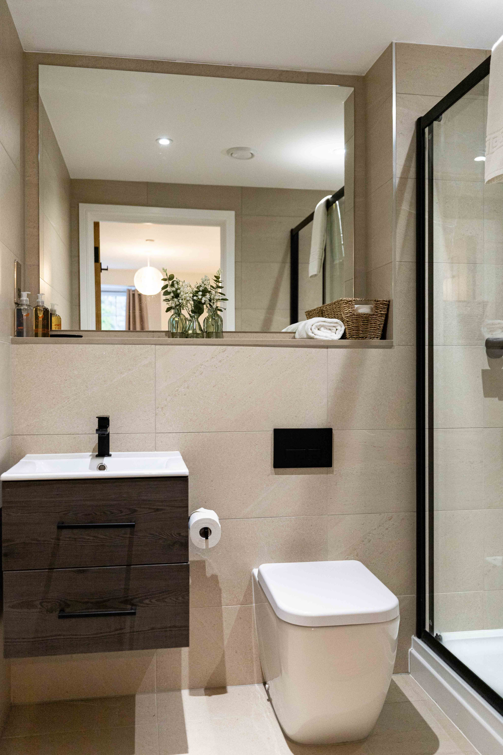 En-suite bathroom: A modern and luxury shower room with large shower with fixed overhead shower head plus separate handheld attachment, wash basin and toilet. Under floor heating.