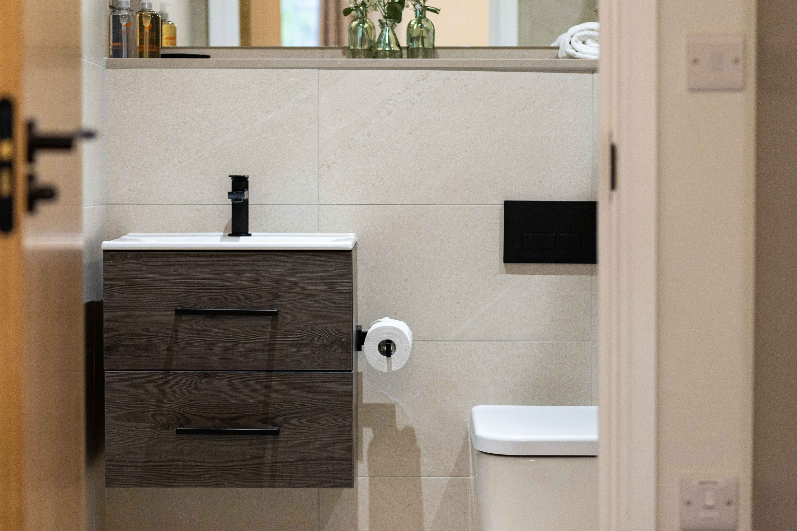 Bathroom: A modern and luxury shower room with large shower with fixed overhead shower head plus separate handheld attachment, wash basin and toilet. Under floor heating.