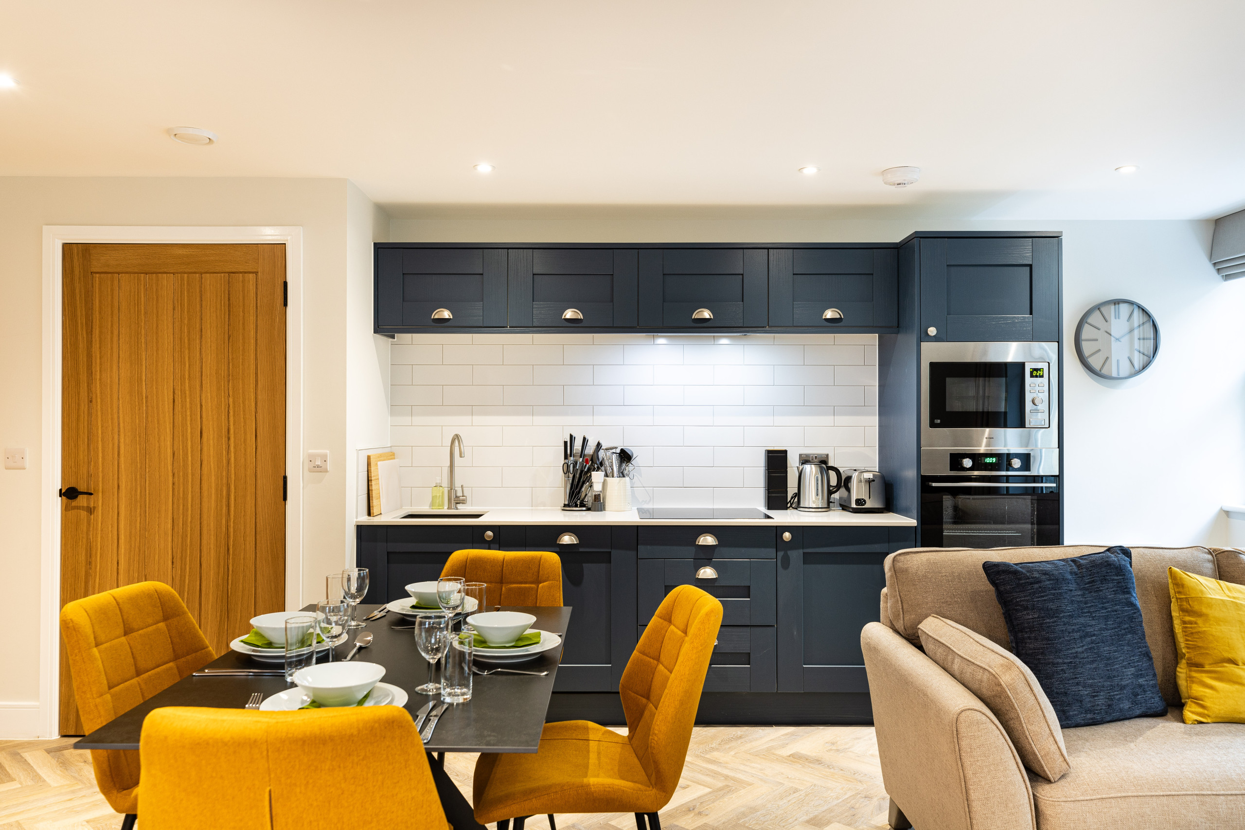 Kitchen area: Offering a fully integrated kitchen with a range of appliances and equipped with all you need for a self-catering stay including an electric oven, microwave, induction hob, Nespresso coffee machine and under-counter fridge with freezer drawer compartment.