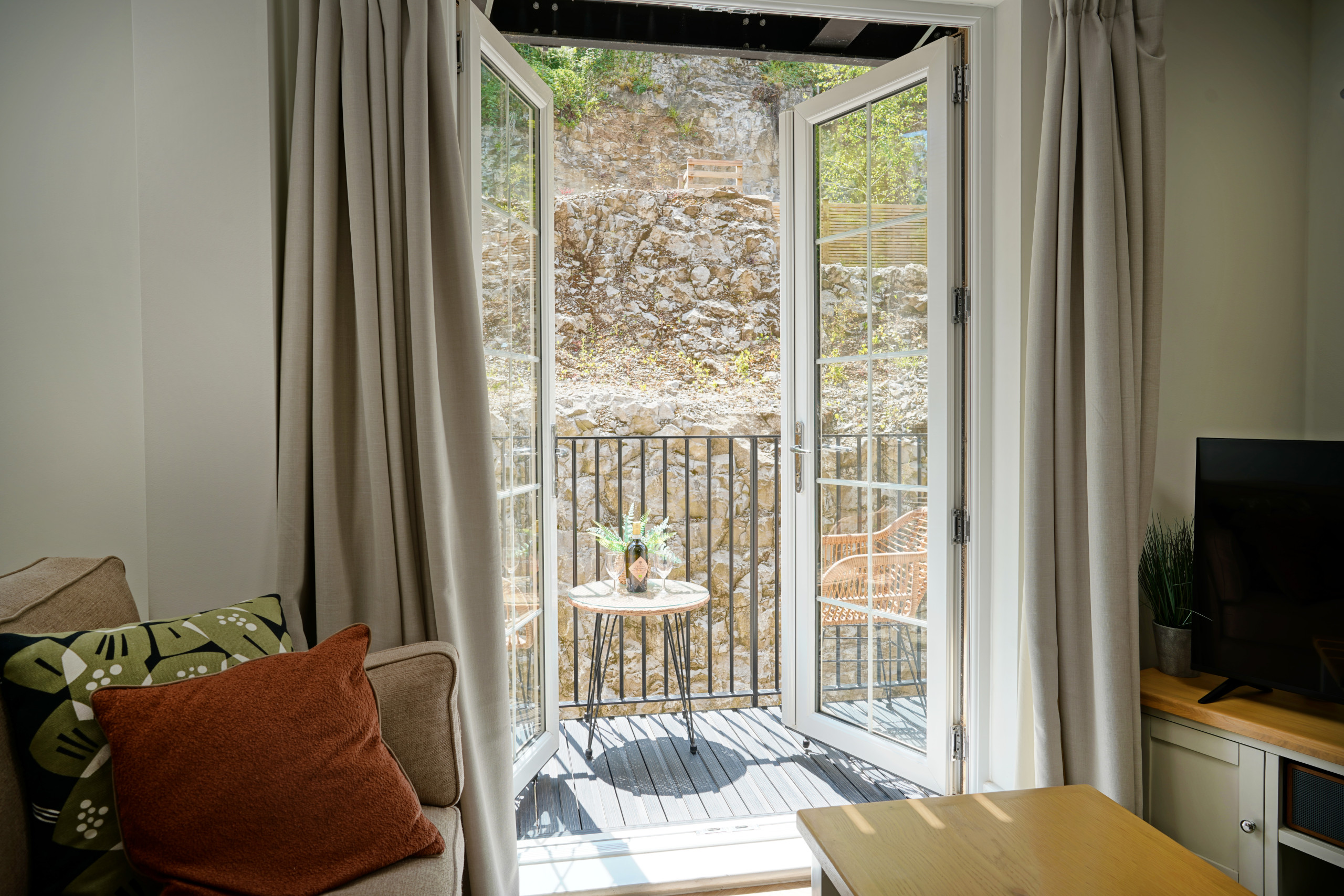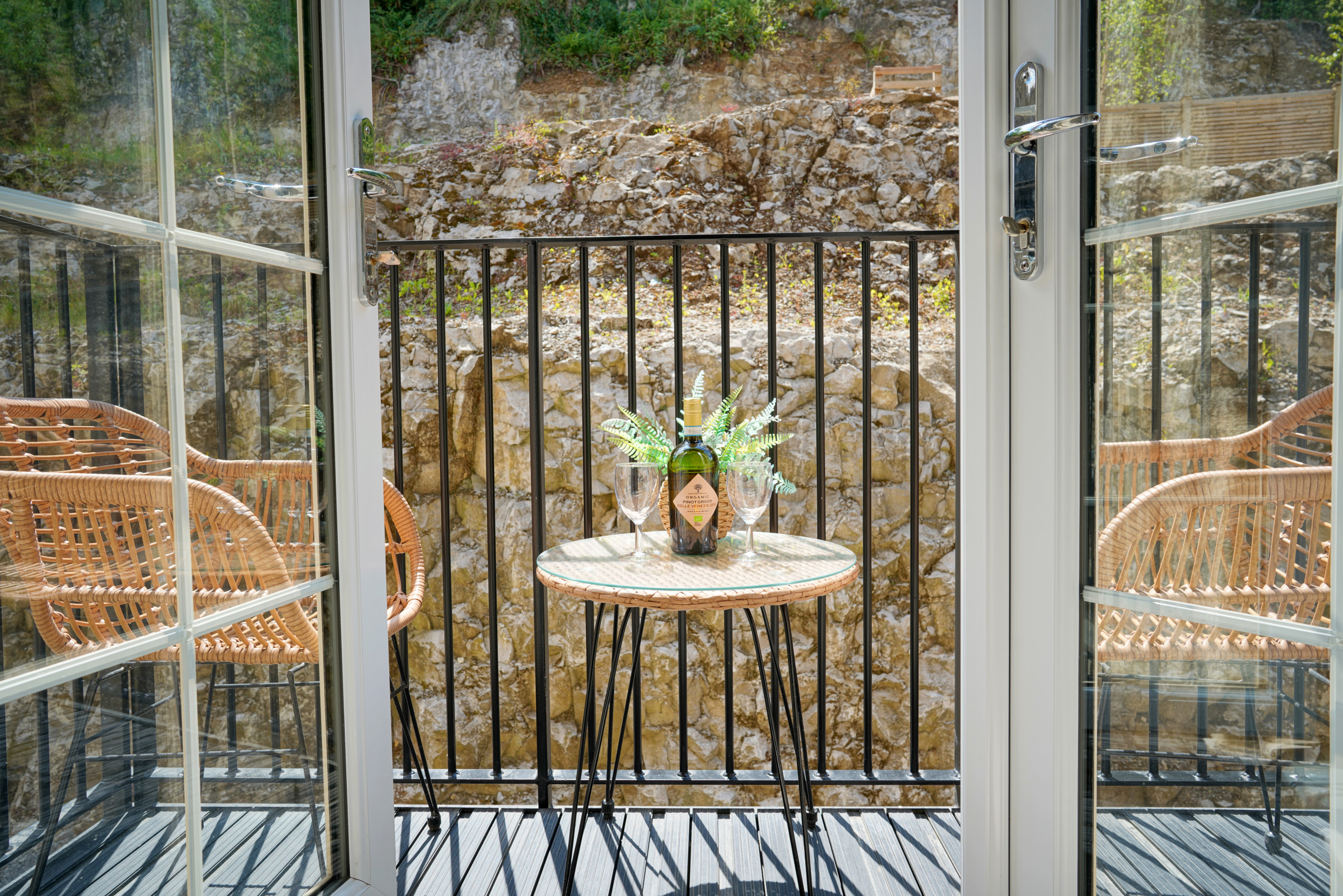 Balcony: French doors opening onto a balcony with outdoor furniture overlooking the limestone cliffs