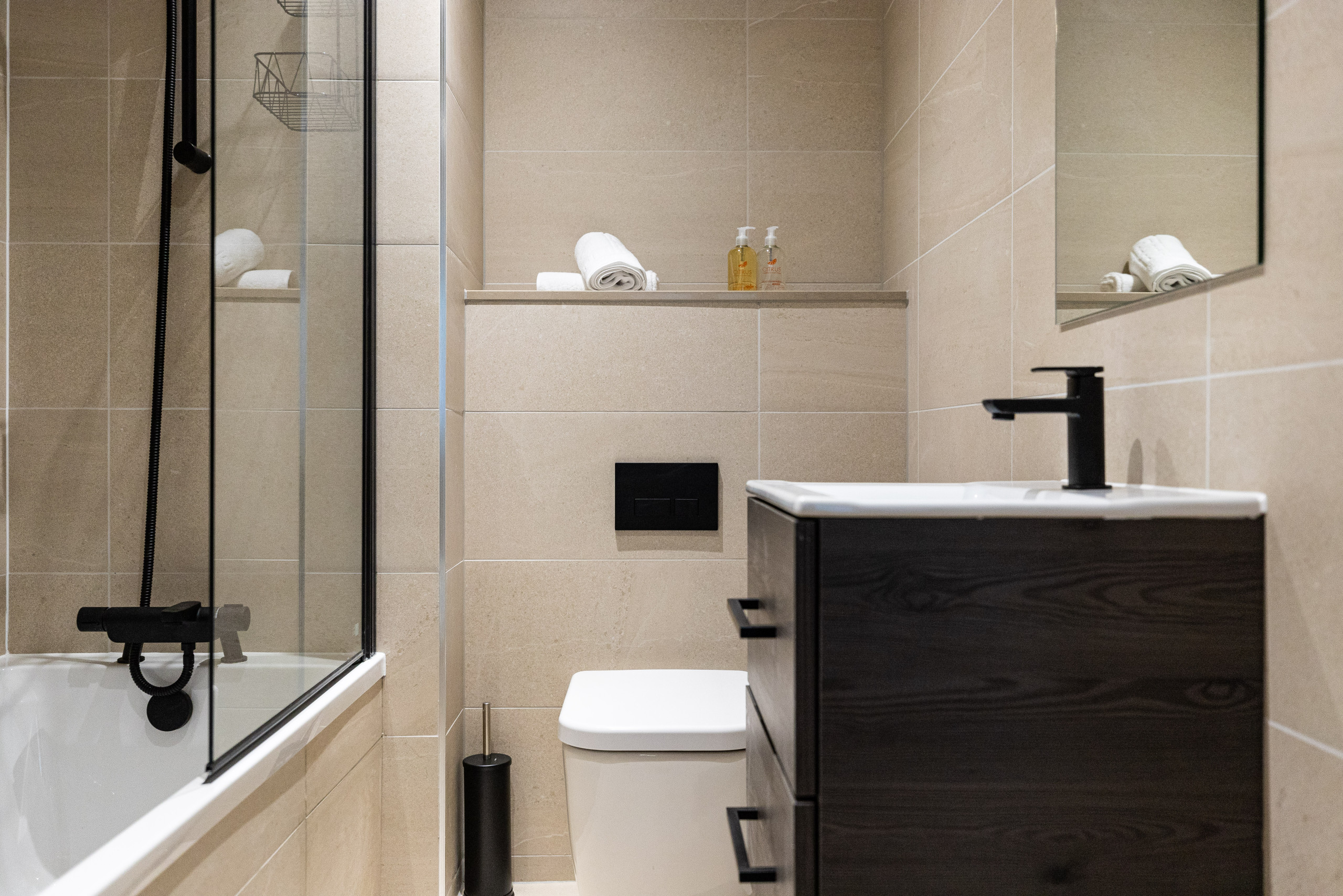 Bathroom: A modern and luxury shower room with large shower with fixed overhead shower head plus separate handheld attachment, wash basin and toilet. Under floor heating.