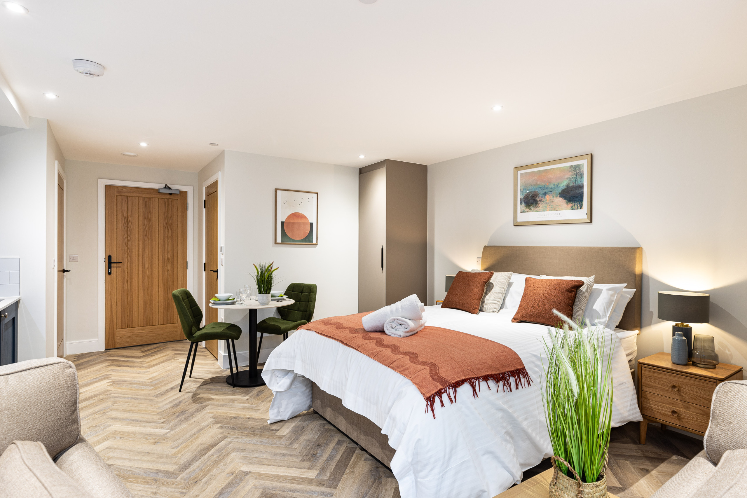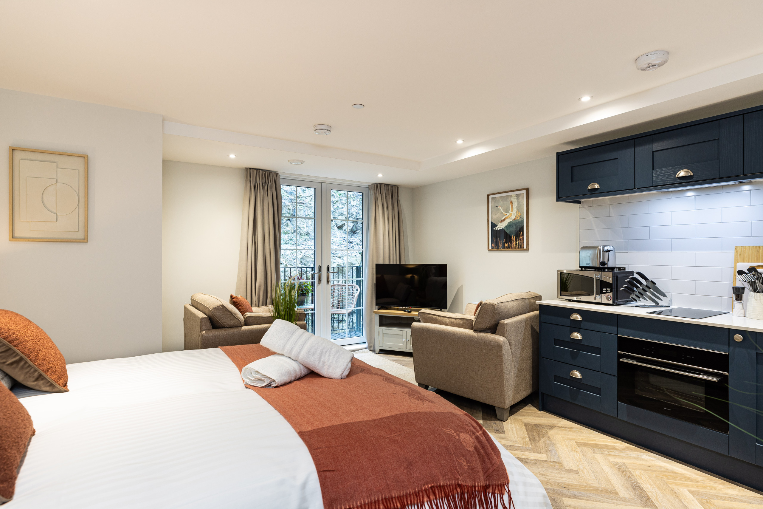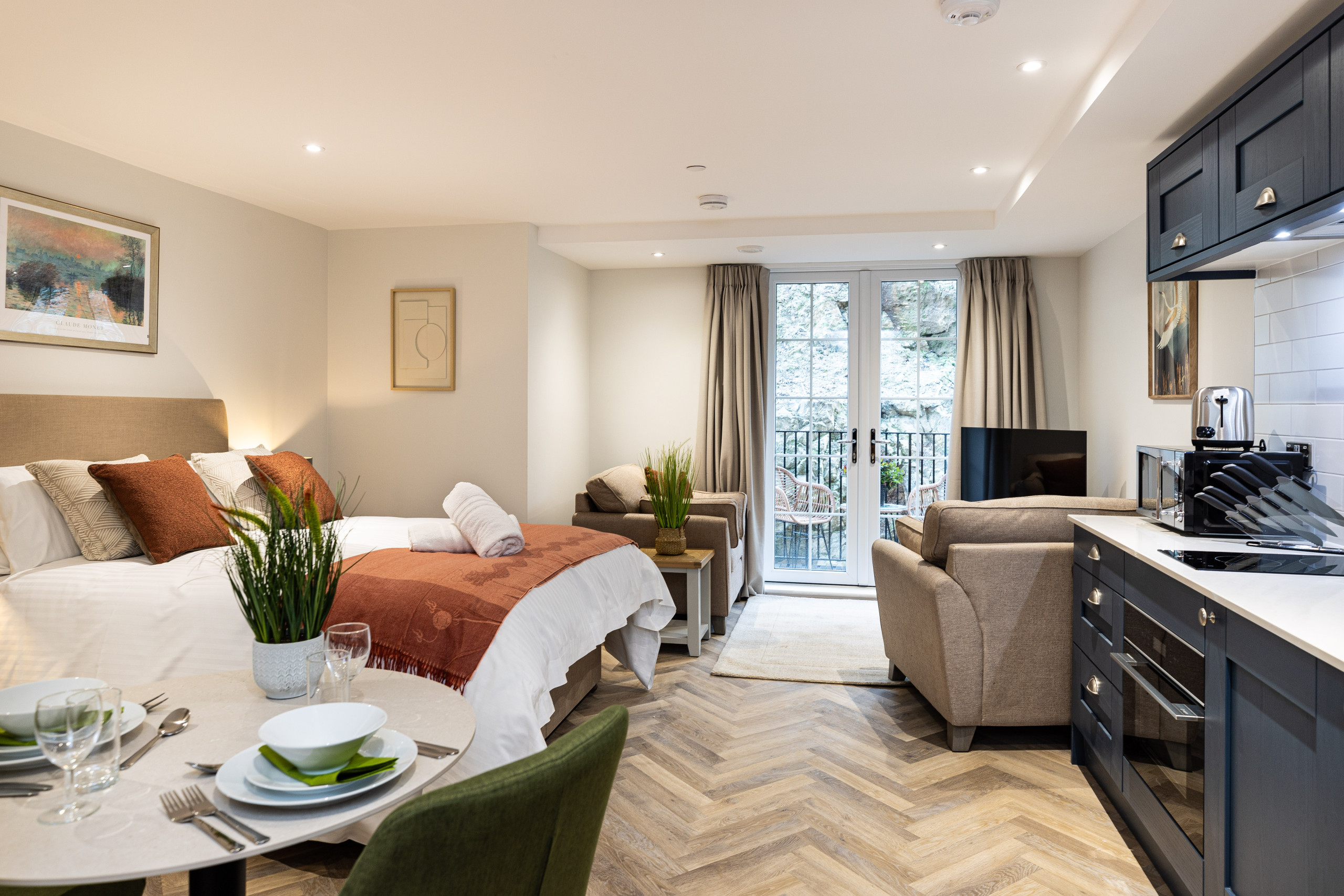A luxury rear facing first floor studio apartment with combined living, dining and sleeping areas with balcony. This apartment is stunningly laid out making use of all the space:
