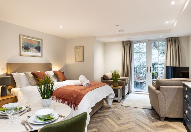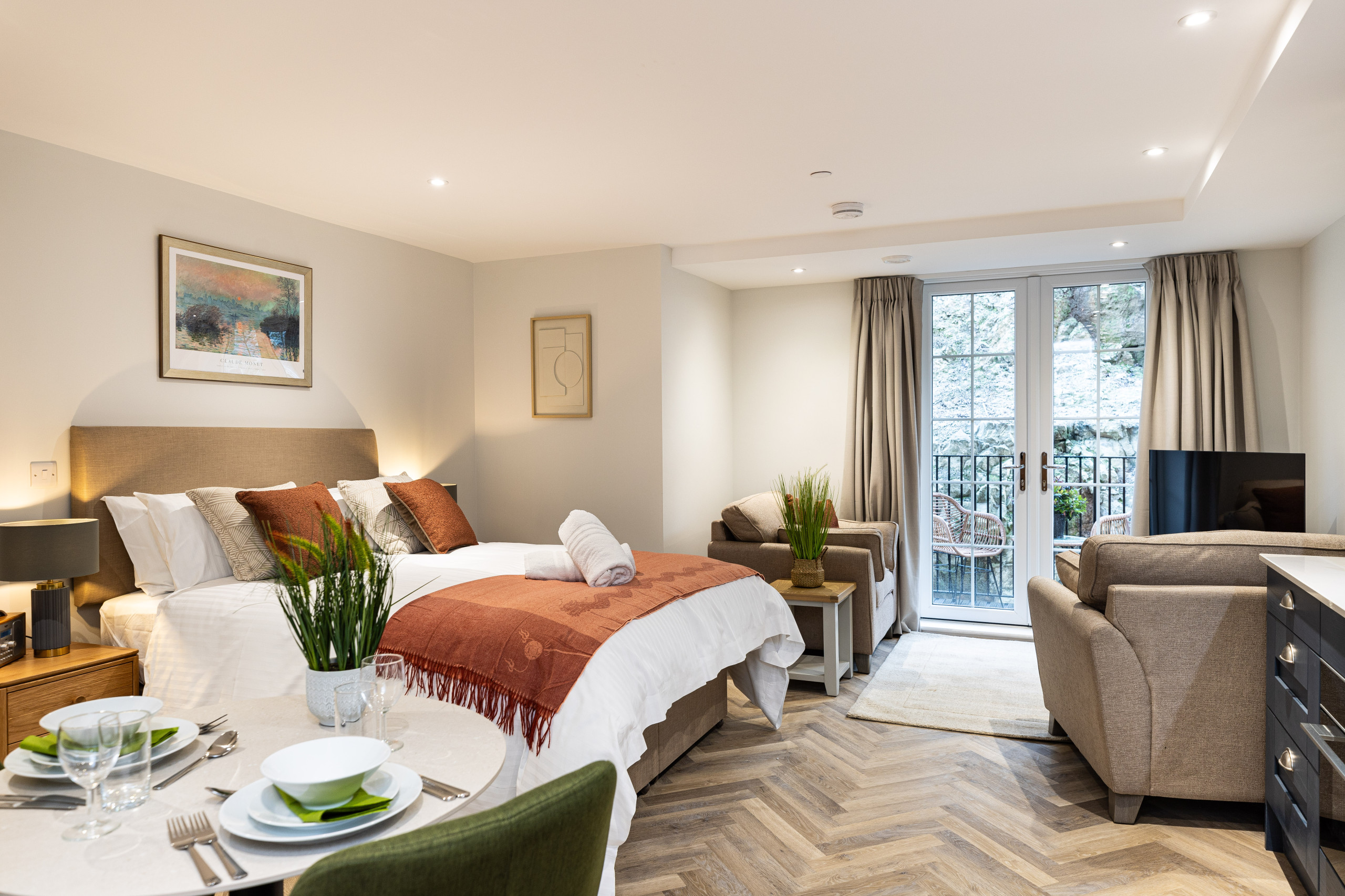 A luxury rear facing ground floor studio apartment with combined living, dining and sleeping areas with terrace. This apartment is stunningly laid out making use of all the space: