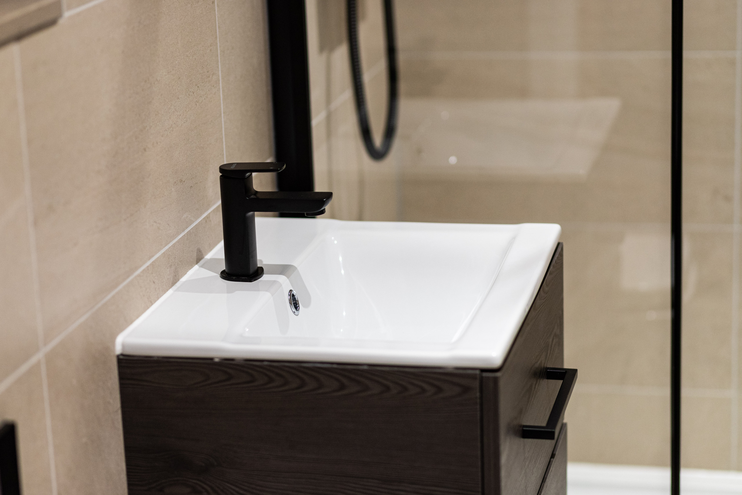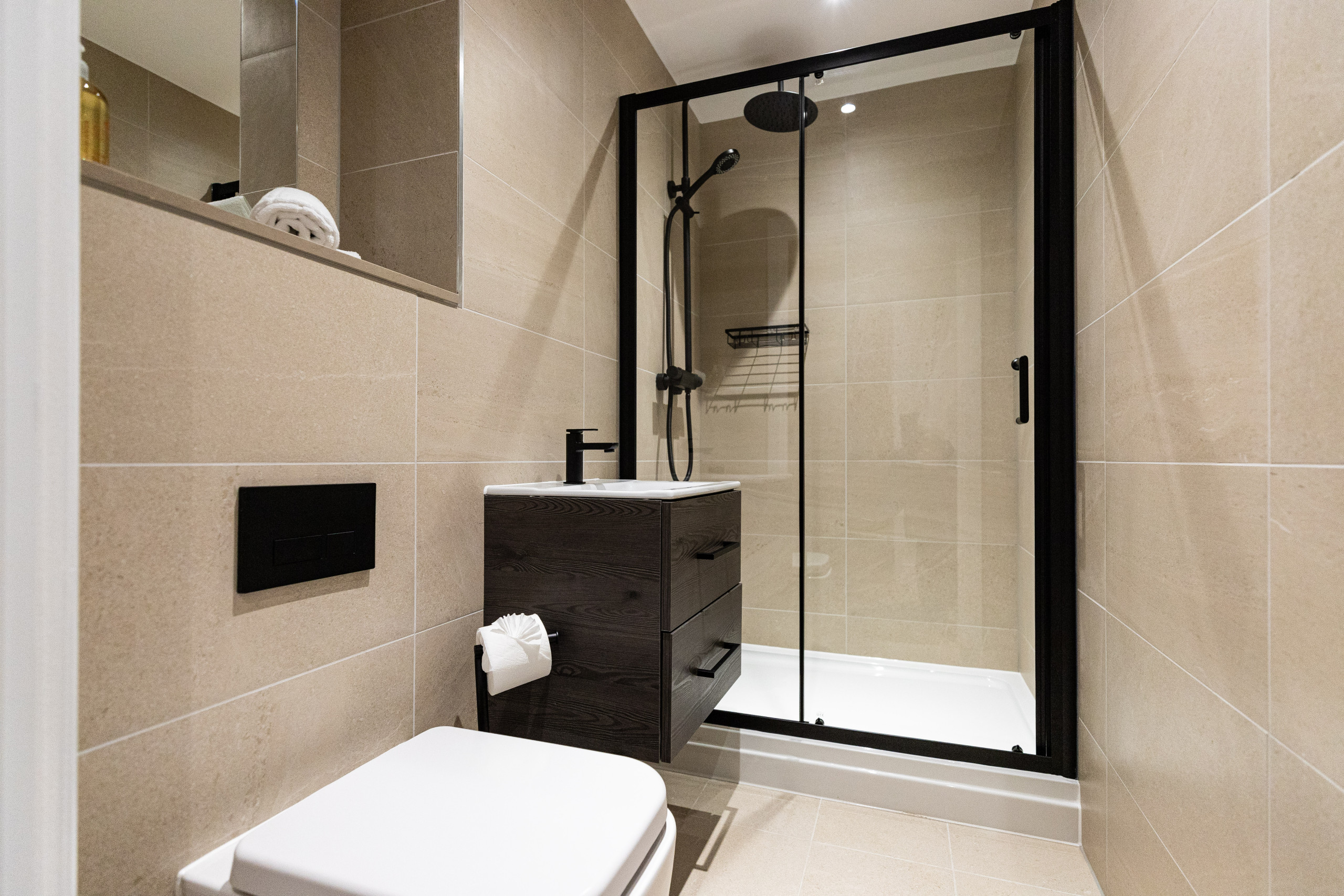 Bathroom: A modern and luxury shower room with large shower with fixed overhead shower head plus separate handheld attachment, wash basin and toilet. Under floor heating.