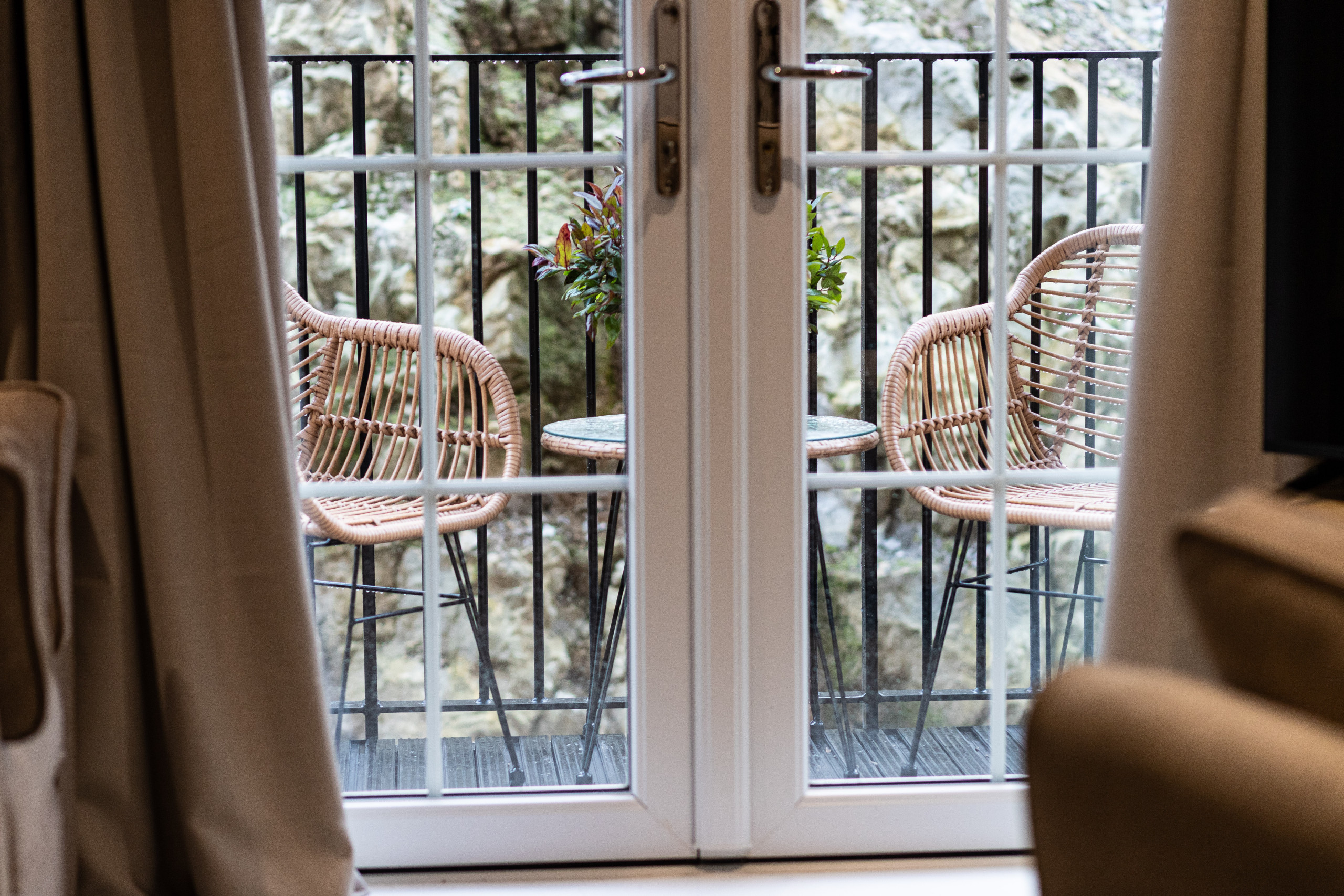 Balcony: French doors opening onto a balcony with outdoor furniture overlooking the limestone cliffs.