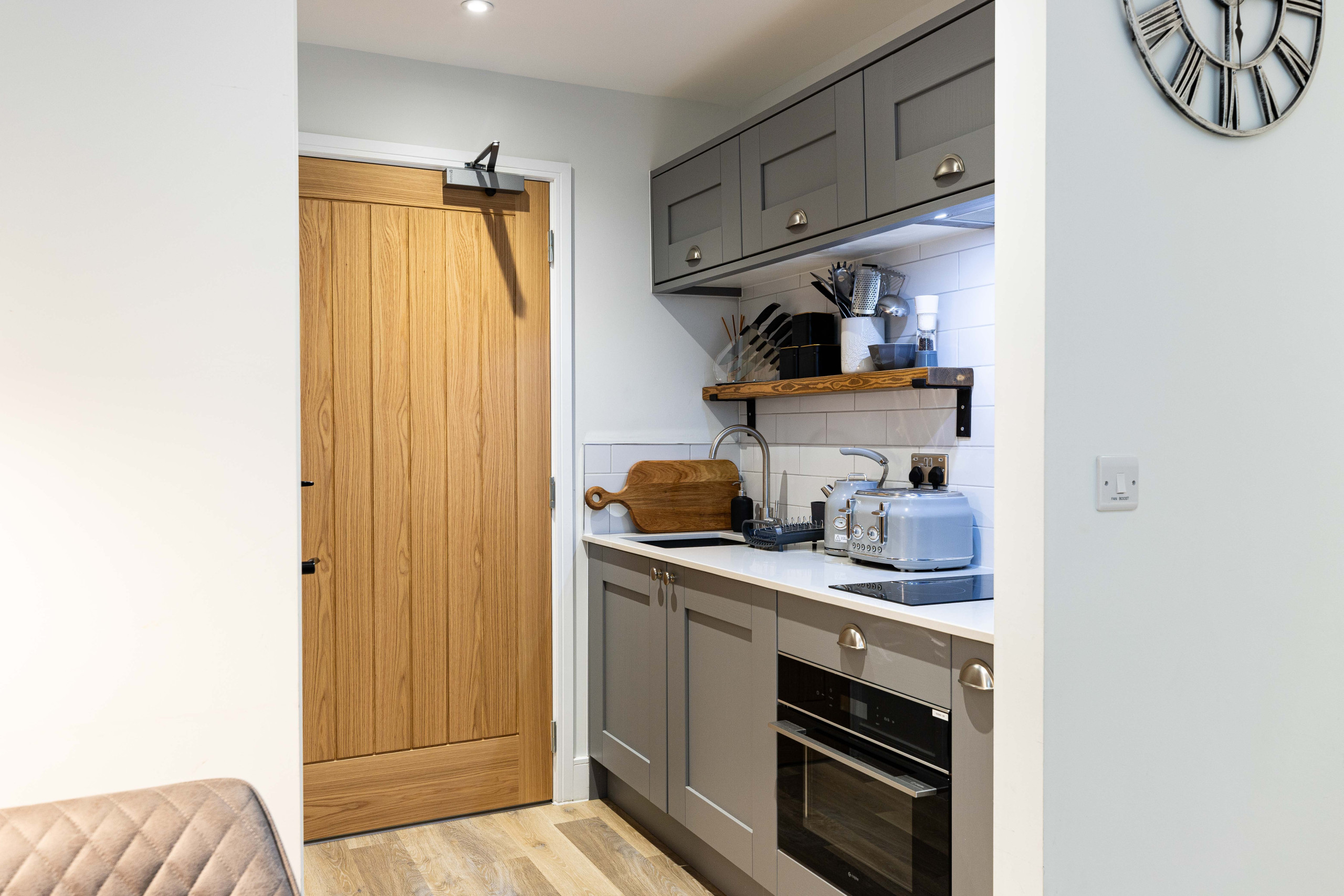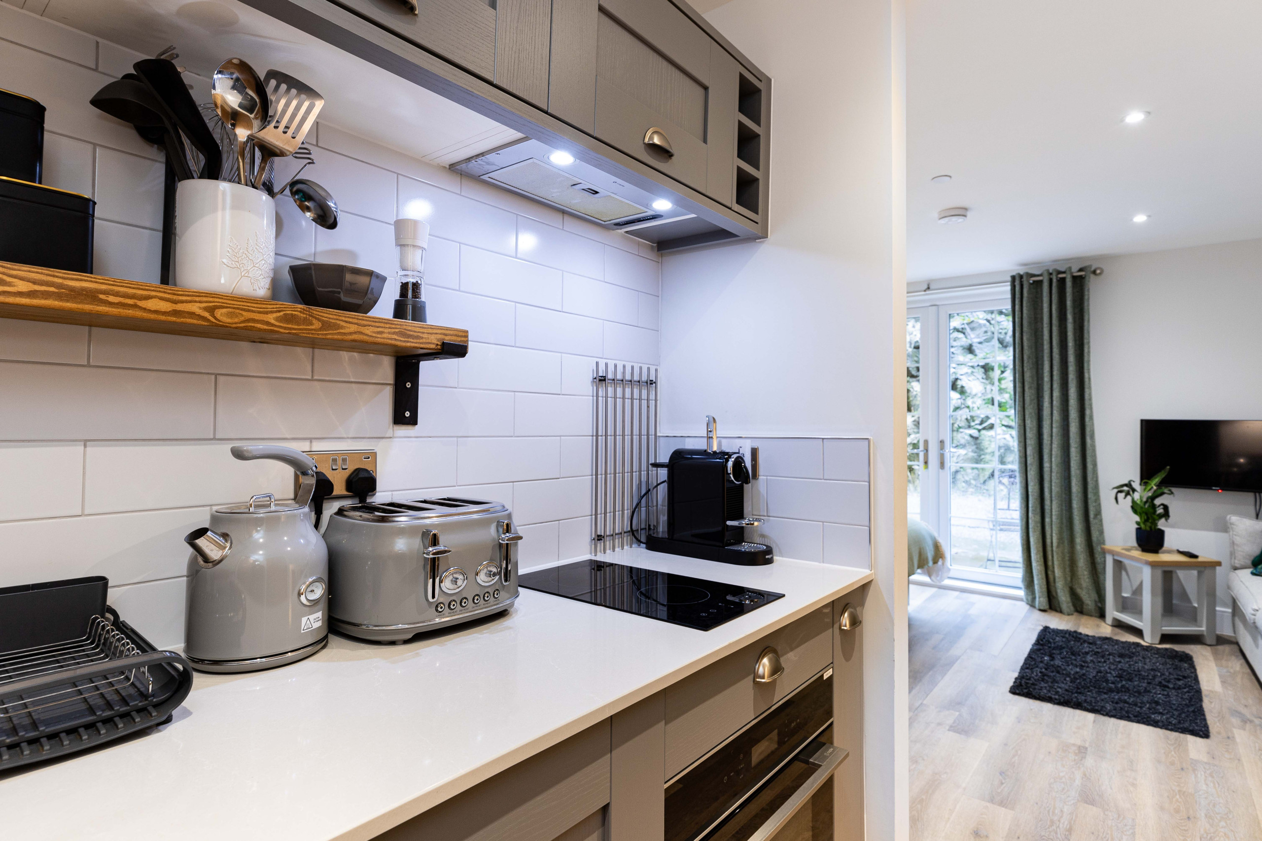 Kitchen area: Offering a fully integrated kitchen with a range of appliances and equipped with all you need for a self-catering stay including an electric combination oven, induction hob, Nespresso coffee machine and under-counter fridge with freezer drawer compartment.