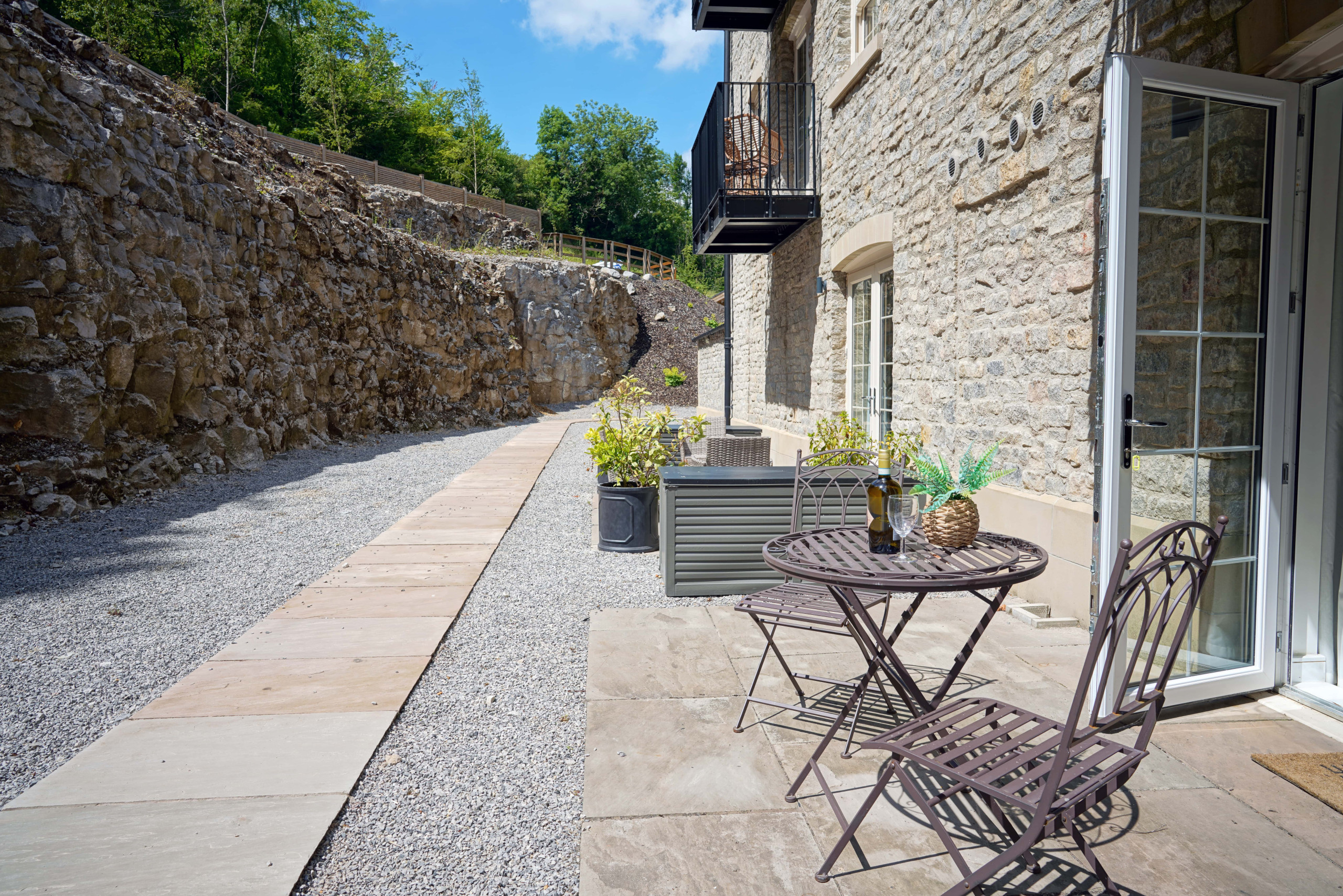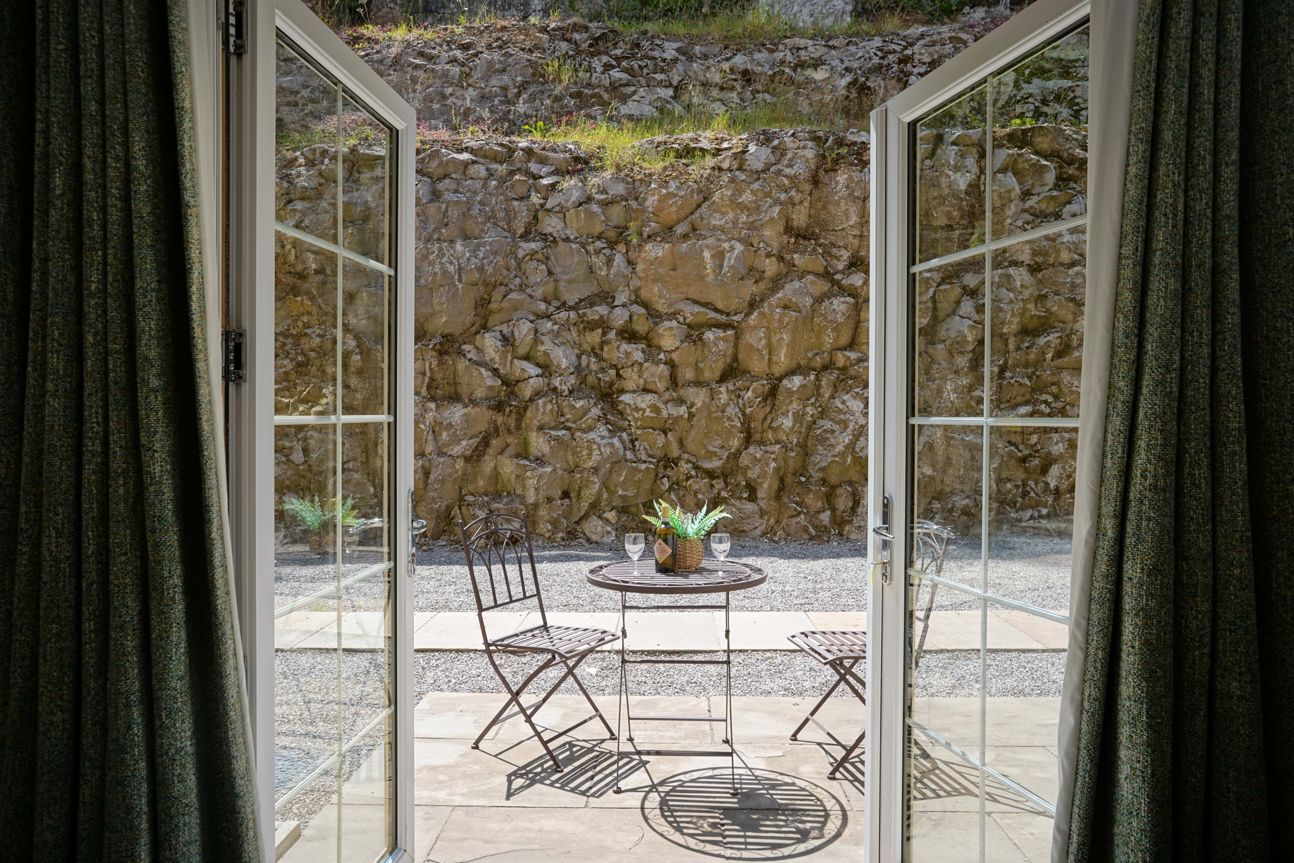 Terrace: French doors opening onto a terrace with outdoor furniture overlooking the limestone cliffs.