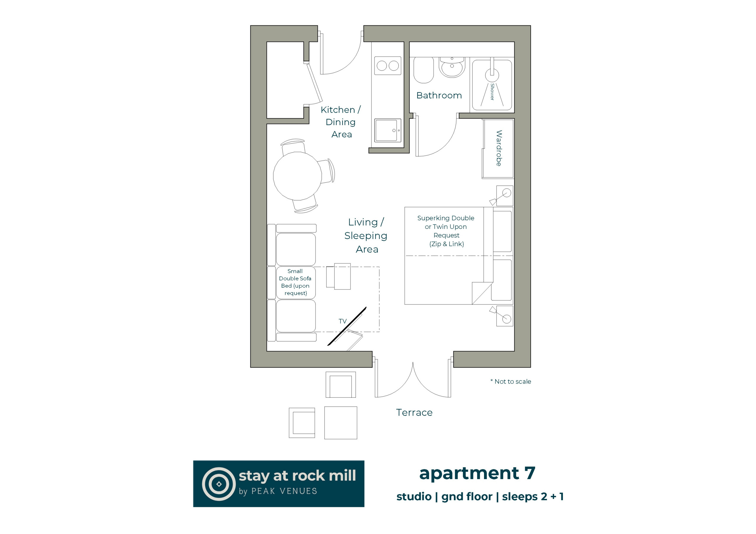 A luxury rear facing ground floor studio apartment with combined living, dining and sleeping areas with terrace. This apartment is stunningly laid out making use of all the space:
